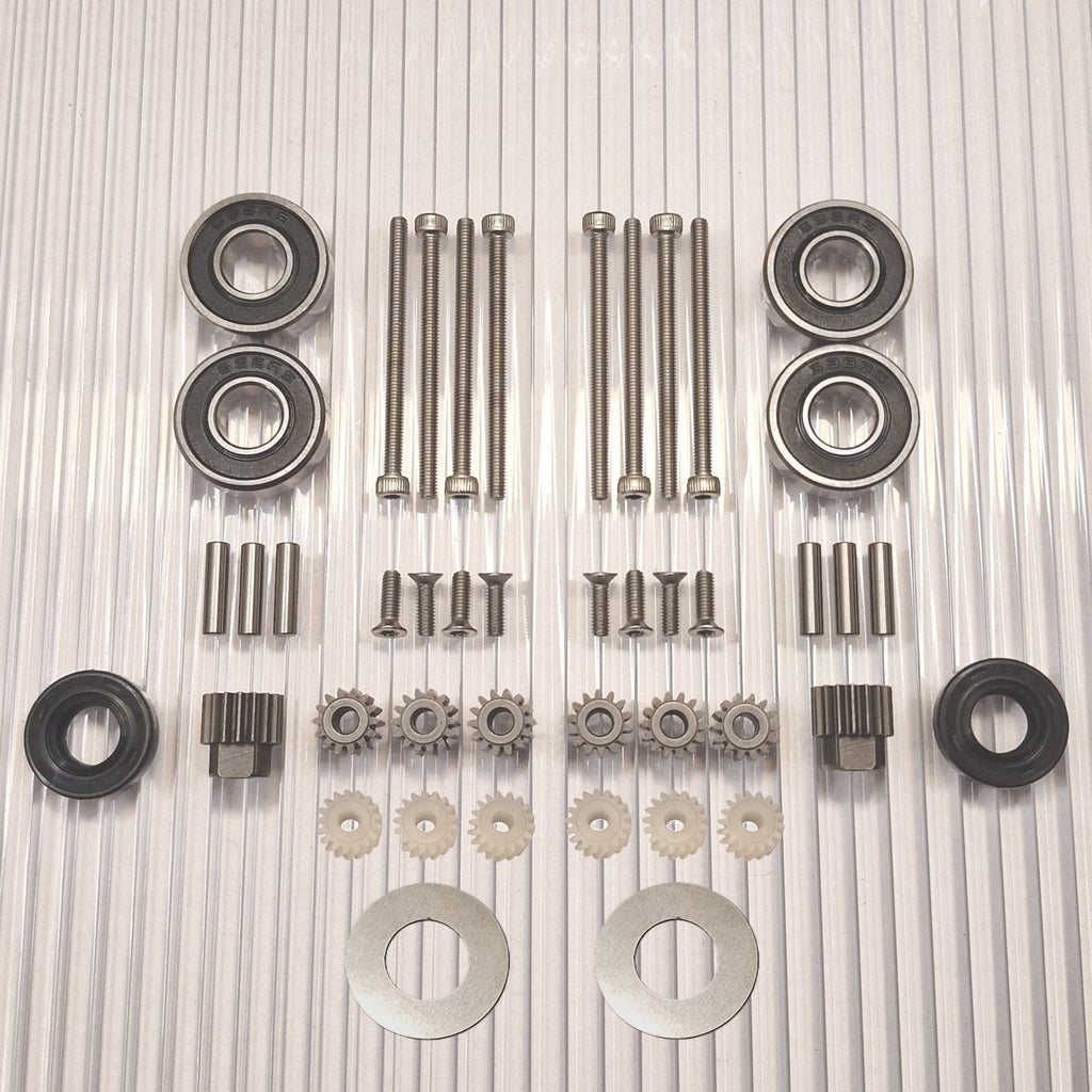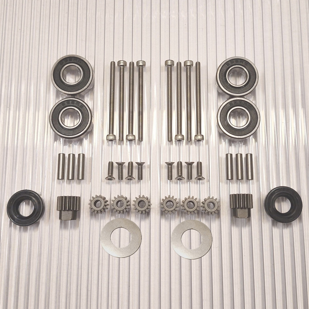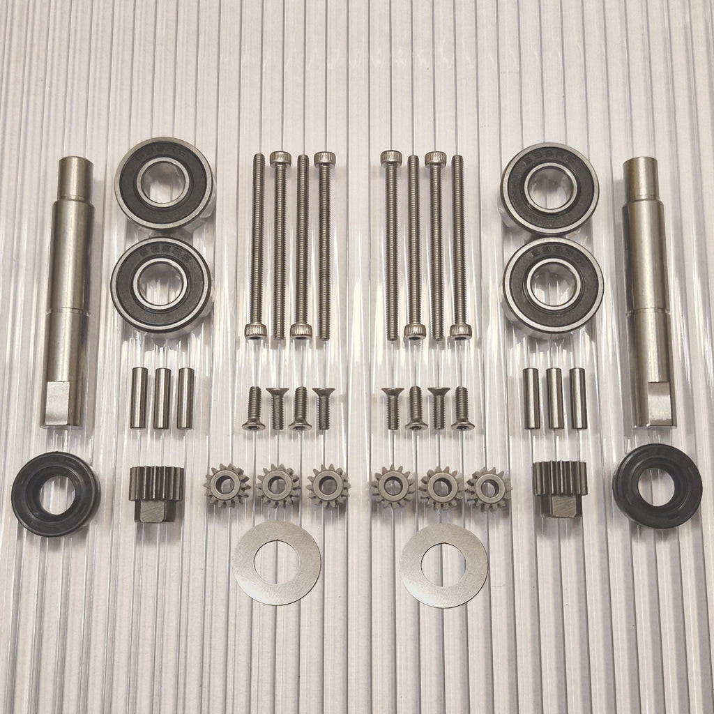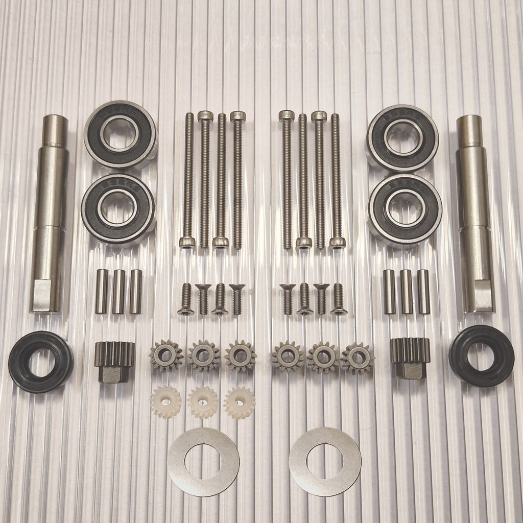 Ahora existe la opción de elegir un kit de actualización que hace que el rodamiento de la rueda sea mucho más resistente y reduce el desgaste de los engranajes, ya que no habrá errores angulares en el agarre del engranaje por mucho tiempo. Este es un kit de conversión que separa los cojinetes de las ruedas aproximadamente 8 mm e incluye un nuevo eje de acero inoxidable más largo y un nuevo retenedor de cojinete exterior que reemplaza al cojinete exterior existente.. La mayor distancia entre los rodamientos significa que el eje ya no se desalinea en ellos. Esto evita la solución de emergencia del líquido de bloqueo entre el eje y los cojinetes de las ruedas, que de otro modo sería recomendable. La reparación es más fácil de realizar y da un buen resultado ya que no es fácil hacer pasar el líquido de bloqueo entre el rodamiento y el eje de forma controlada. El eje se desgasta a menudo y este kit elimina esta debilidad que viene incorporada en todos estos motores de fábrica y desgasta los engranajes.