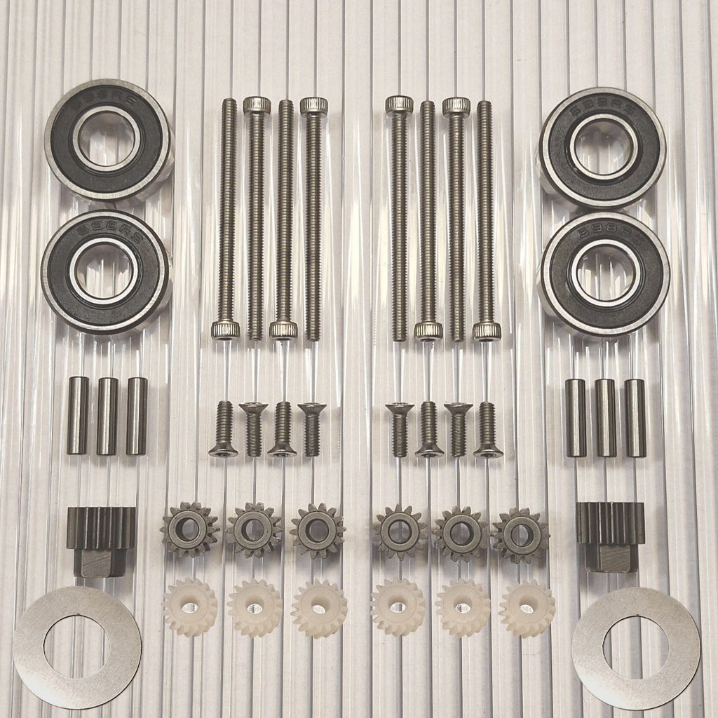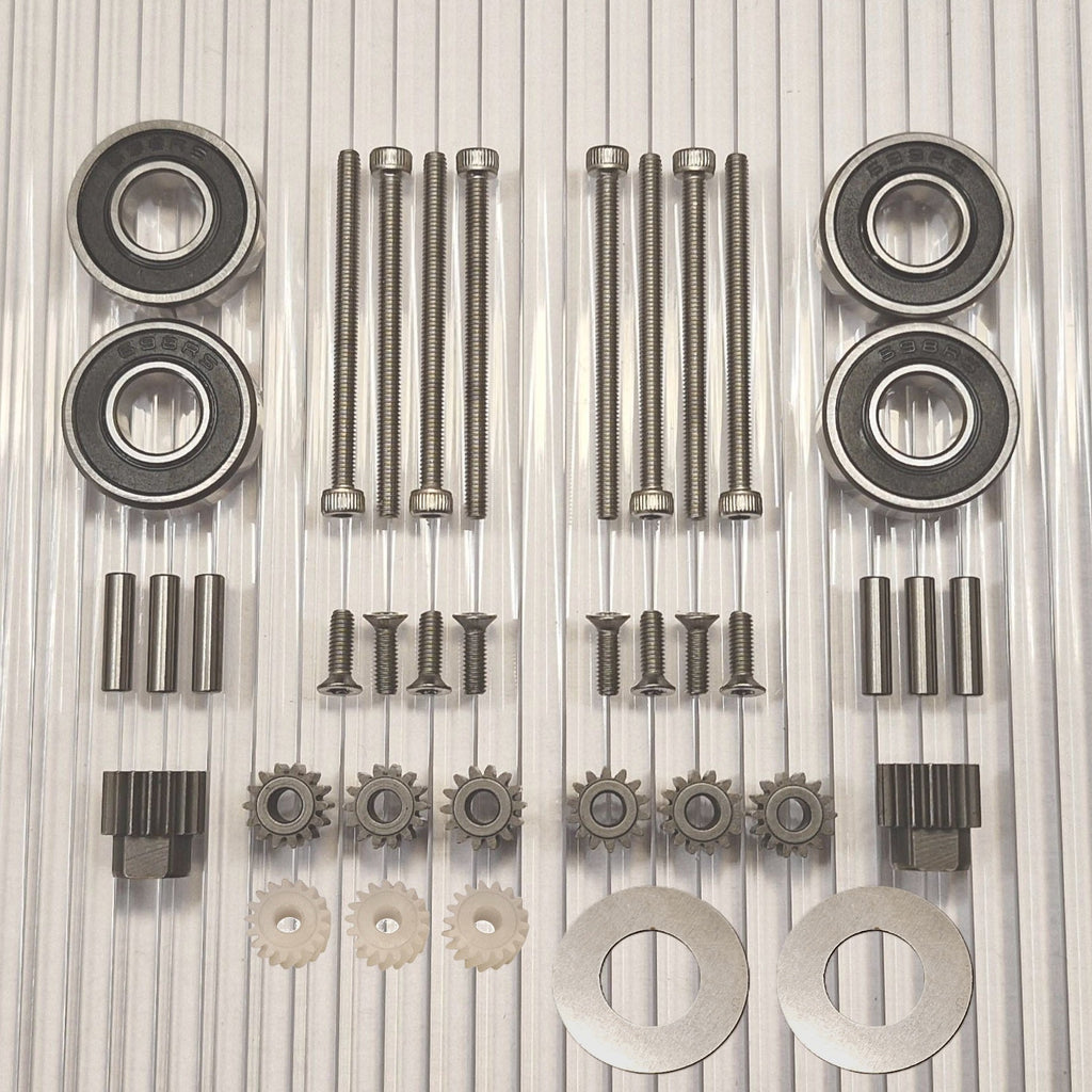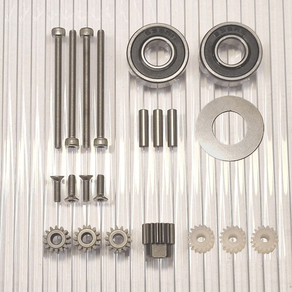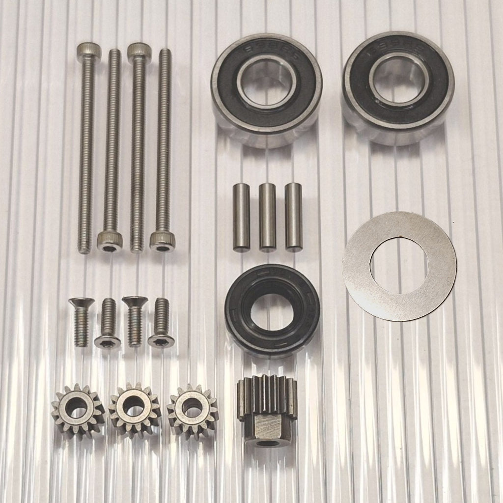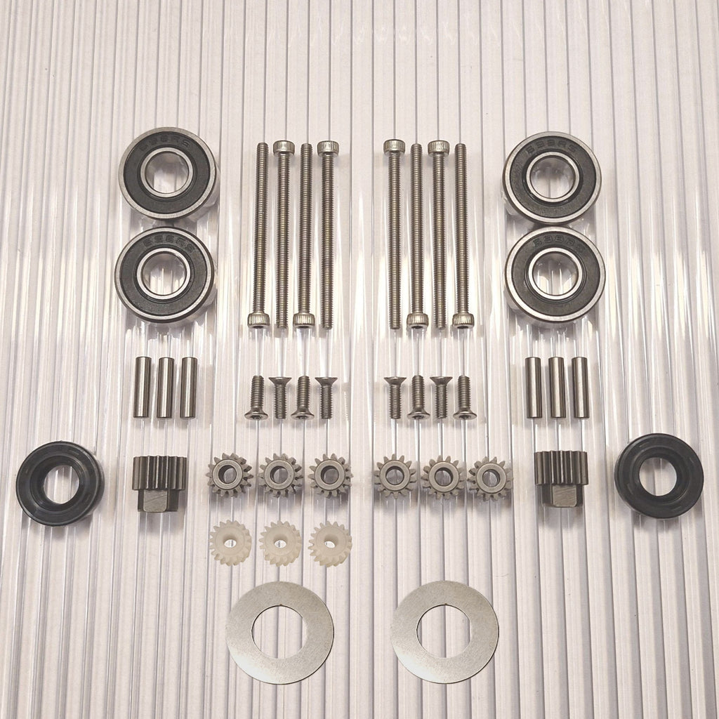 Ahora existe la opción de elegir un kit de actualización que hace que el rodamiento de la rueda sea mucho más resistente y reduce el desgaste de los engranajes, ya que no habrá errores angulares en el agarre del engranaje por mucho tiempo. Este es un kit de conversión que separa los cojinetes de las ruedas aproximadamente 8 mm e incluye un nuevo eje de acero inoxidable más largo y un nuevo retenedor de cojinete exterior que reemplaza al cojinete exterior existente.. La mayor distancia entre los rodamientos significa que el eje ya no se desalinea en ellos. Esto evita la solución de emergencia del líquido de bloqueo entre el eje y los cojinetes de las ruedas, que de otro modo sería recomendable. La reparación es más fácil de realizar y da un buen resultado ya que no es fácil hacer pasar el líquido de bloqueo entre el rodamiento y el eje de forma controlada. El eje se desgasta a menudo y este kit elimina esta debilidad que viene incorporada en todos estos motores de fábrica y desgasta los engranajes.